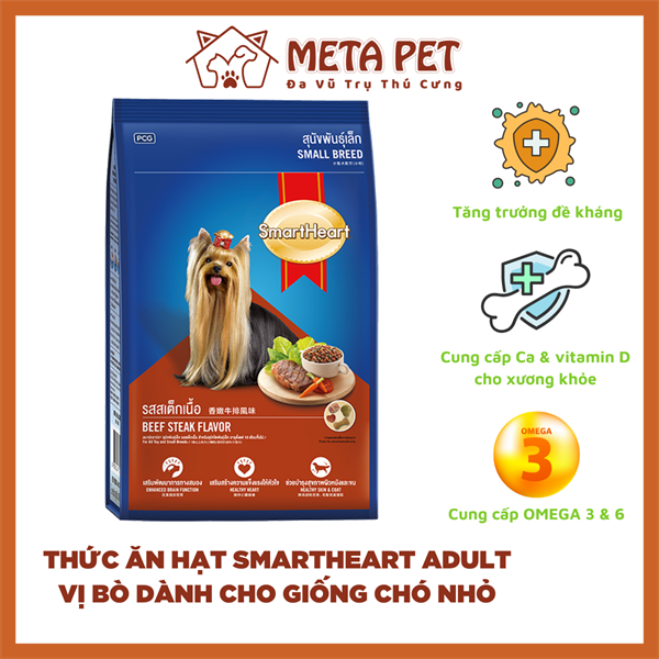 Thức ăn dành cho Chó Giống Nhỏ SmartHeart đáp ứng được nhu cầu dinh dưỡng dành cho chó giống nhỏ, sử dụng thành phần có chất lượng tốt, được bổ sung Dầu cá (giàu DHA và Axit Béo Omega-3) và Lecithin, giàu Colin giúp tăng cường chức năng não và hệ thần kinh, tăng cường sức khỏe tim mạch. Thức ăn dạng nghiền nhỏ giúp giảm tổn hại về răng.
